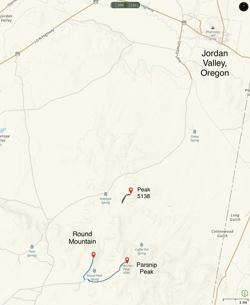 Parsnip Peak is the highest Oregon Owyhee summit south of Jordan Valley, Oregon. It is the only distinctive summit in the area. Nearby Round Mountain and Peak 5138 are also good hiking destinations if you are in the area.