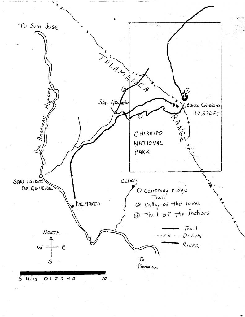 I awoke about 11AM and was astonished to see a comet with its fiery tail glowing in the sky. I woke up Randy and Tom so that they could see the show. I never learned the name of the comet. The next day we continued to explore the park’s upper reaches. The park has all that Costa Rica has to offer in the way of mountaineering. Although all of the summits have been reached, there are many rock walls of from 500 to 1,000 feet which offer some technical climbing opportunities. Cerros Lagunas and Truncado are the most impressive peaks above the Valley of the Lakes. In the south, Cerro Terbi and Pica Sureste are the highest summits. The majority of the summits from the Park boundary to the Panama border are unexplored. The entire Atlantic slope is virgin territory protected by dense rain forest. Several grassy savannas have no recorded visits by man.