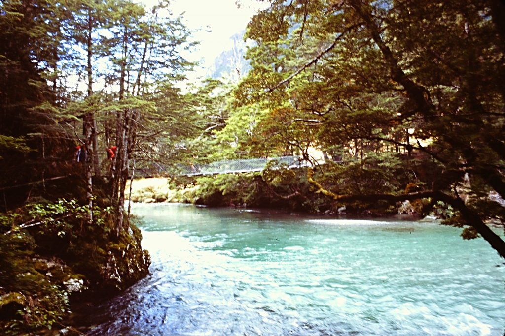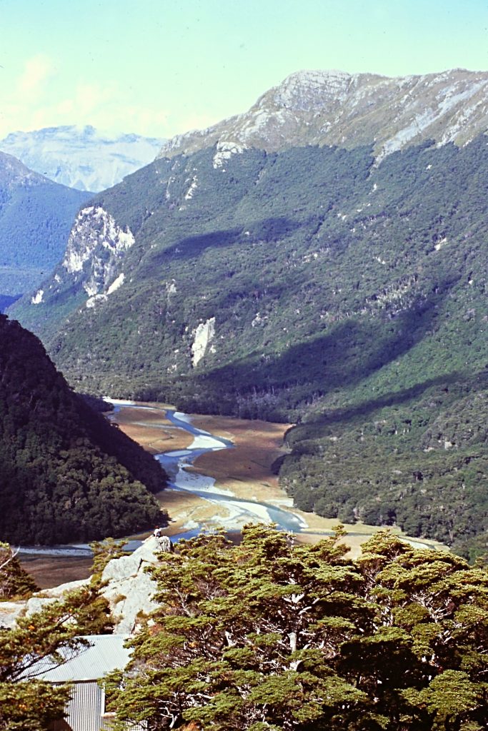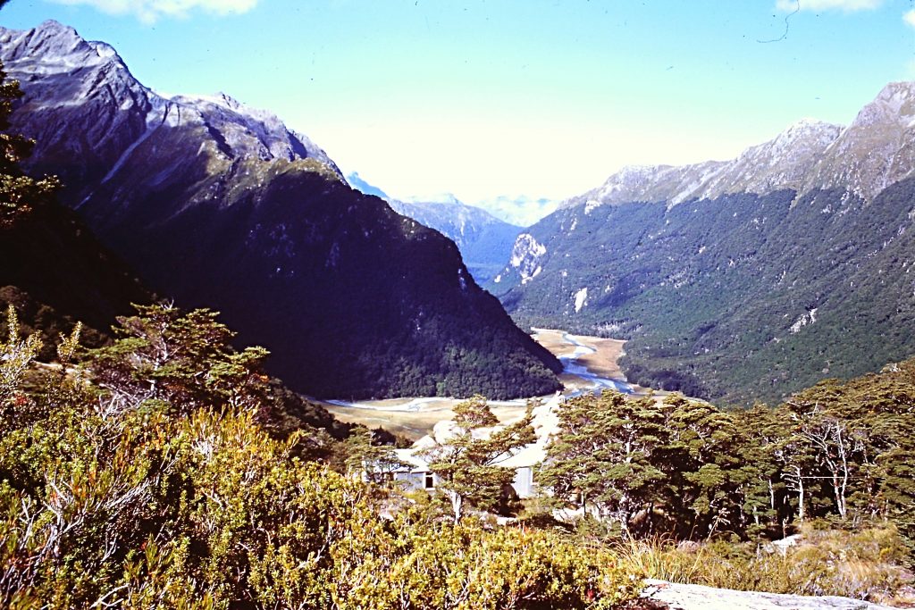 The Routeburn Track crossed an section of the Southern Alps that is lower than the Mount Cook area. The first day took us from the trailhead to the Routeburn Falls Hut in 5.5 miles. Our hike was through a spectacular glacially-carved valley. The trail crossed several suspension bridges and grassy meadows and made a steady climb through a beech forest. The views from the comfortable hut were outstanding. As I recall, the guide was the only New Zealander and everyone else was Australian. The hut was too cozy and comfortable to be fairly called a hut. We even had hot water.