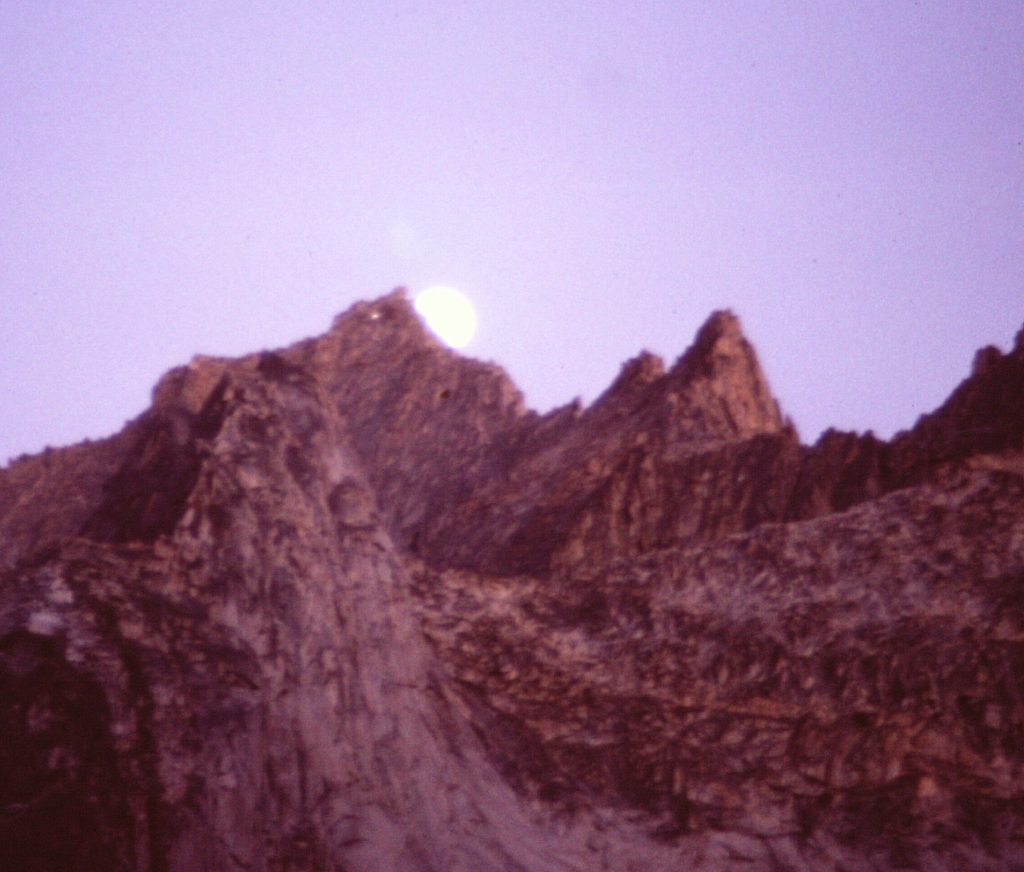 On the 2nd day, I hiked only 5 miles to Hamilton Lake. The trail was busy and I spent a lot of the day interviewing hikers. That evening I was sitting in camp enjoying the alpen glow on the Great Western Divide when I noticed a bright light on Kaweah Gap. I thought, “Who would carry such a massive flashlight into the backcountry?” A few minutes later, it dawned on me that what I was seeing was Moon rising over the divide. It was a surreal experience for a few minutes.