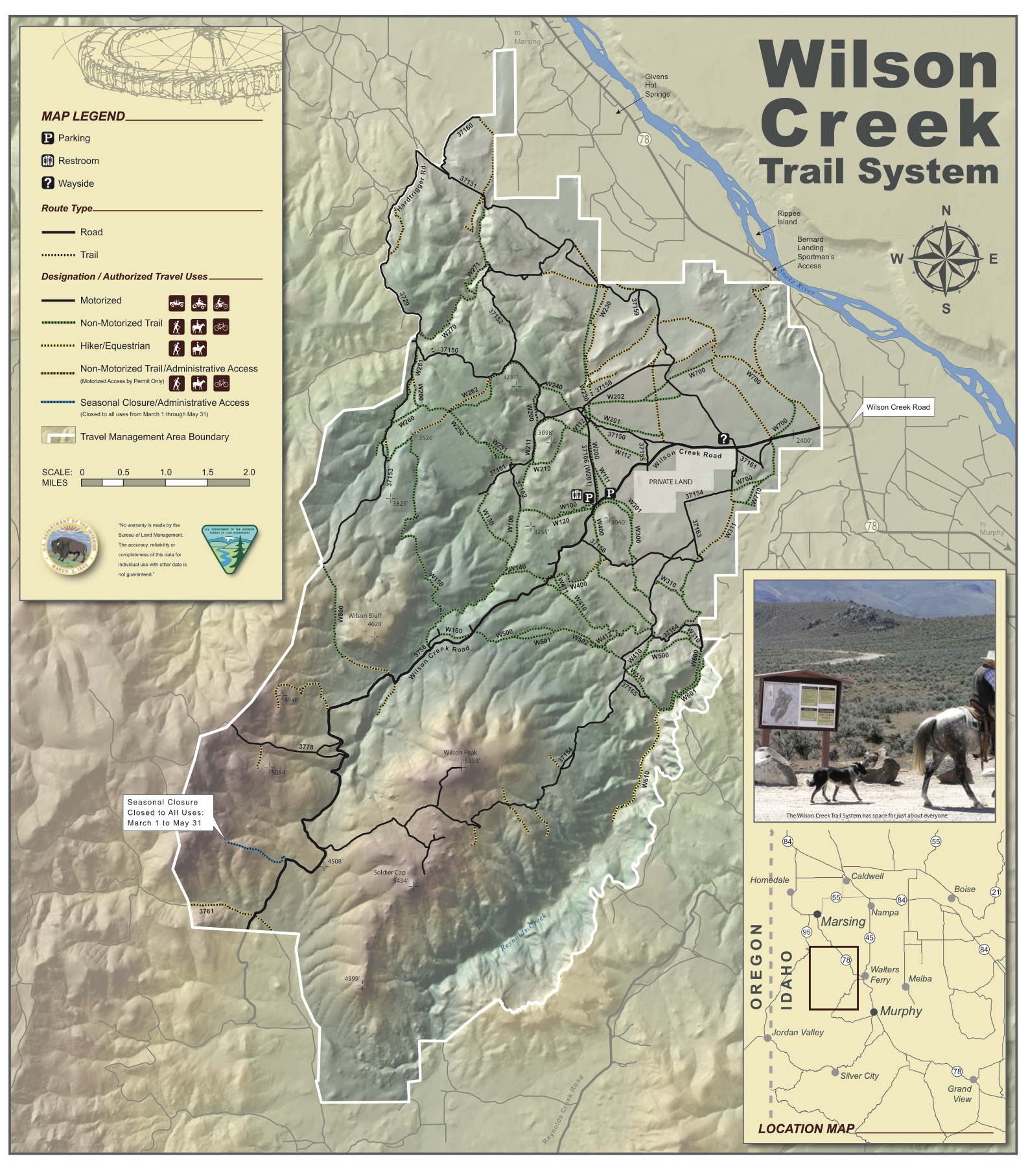 Wilson Creek is located on the North Side of the Owyhee Mountains. The BLM maintains the Wilson Creek Road and Trail System primarily for recreational use, including both motorized and non-motorized designated trails. Also see the BLM’s Travel Management page for this area.